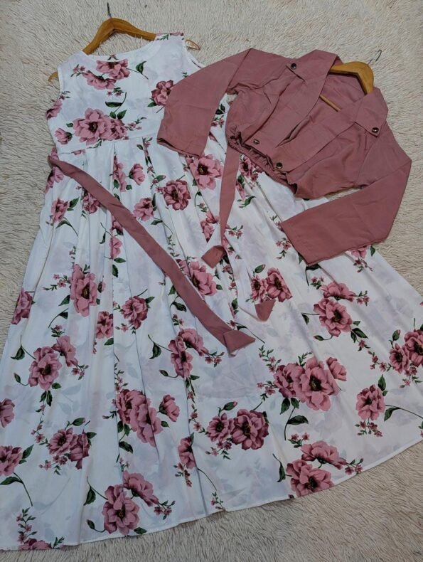 This elegant floral printed maxi dress is crafted from soft, breathable fabric for all-day comfort. The smocked bodice offers a flattering fit, while the flowy maxi skirt adds a graceful and feminine touch. Paired with a stylish dusty pink cropped shrug, this two-piece outfit creates a perfectly coordinated and chic look.